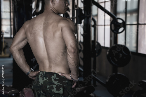 Naklejka premium Close up view of sexy body of young man with six pack muscular and athletic...