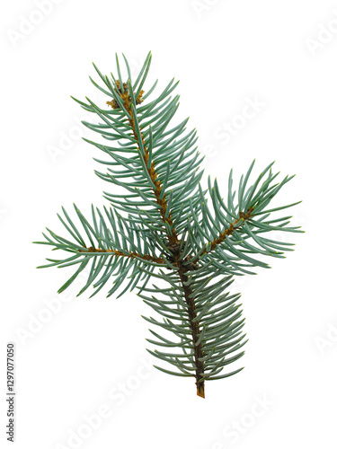 © Іванна Поліщук, Naklejka premium Close-up view of spruce branch displaying its delicate soft needles Branch showcases vibrant green hues characteristic of healthy coniferous trees illuminated by natural light Isolated on white backgr