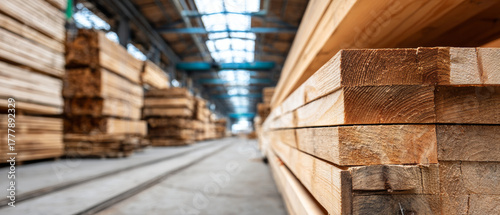 Fototapeta premium Close-up view of stacked wooden planks inside a spacious lumber warehouse with blurred background showing rows of timber and industrial roof structure