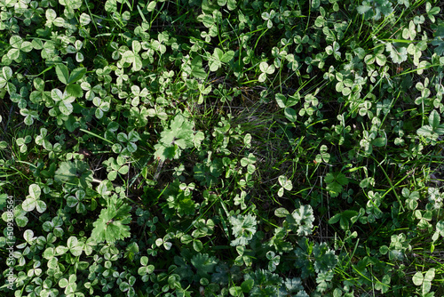 Obraz premium Close-up view of summer green lawn grass, microclover in sunlight