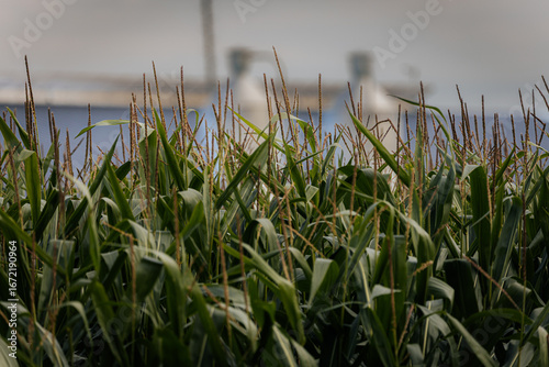 © Emvats, Fototapeta premium Close-up view of tall green corn plants with tassels, with blurred farm silos and a building in the background.