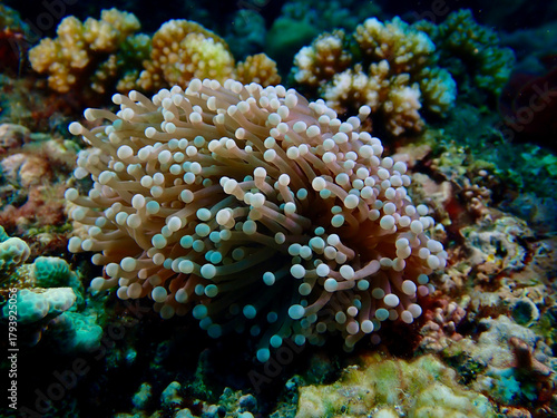 © Houston, Naklejka premium Close-up view of tentacles of a sea anemone underwater. The detailed texture highlights the organic patterns of the marine creature.
