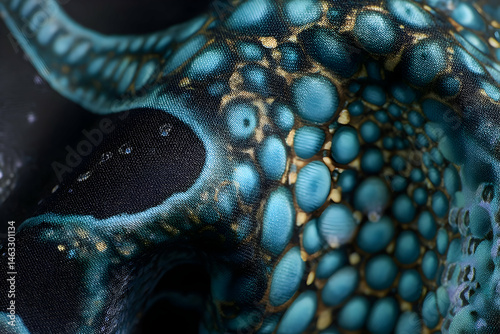 © Muhammad, Obraz premium Close-up view of textured fabric with deep blue and gold designs.