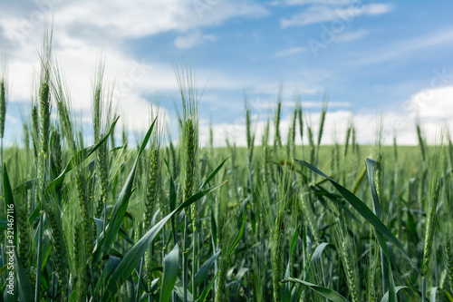 © Olga Gudumac, Fototapeta premium Close-up view of the ears of green wheat