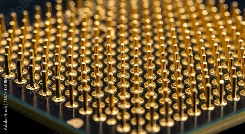 © Muhammad, Obraz premium Close-up view of the golden pins on the underside of a computer processor chip, highlighting its intricate design and technological complexity.