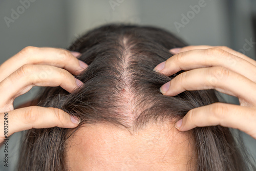 © dtatiana, Fototapeta premium Close-up view of the head with traces of blood from injections after mesotherapy, treatment of alopecia