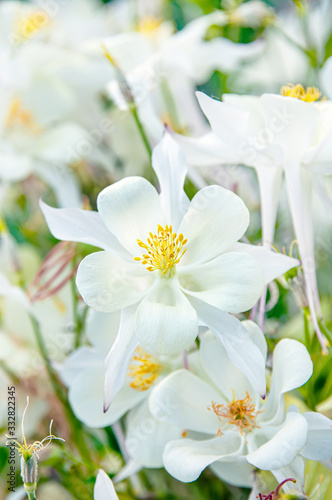 Fototapeta premium Close-up view of the white Aquilegia columbina flower. Selective focus,...