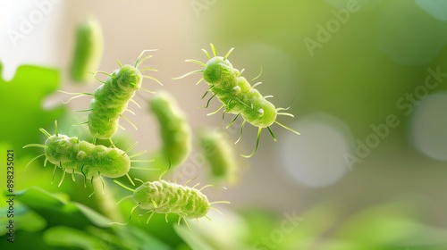 Naklejka premium Close-up view of tiny green insects on leaves, showcasing nature's intricate...