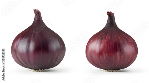© wannakorn, Fototapeta premium Close-Up View of Two Fresh Purple Onions with Glossy Skin on White Background