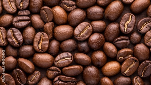 © mudrika, Naklejka premium Close-up view of various roasted coffee beans scattered on a textured surface, showcasing rich color
