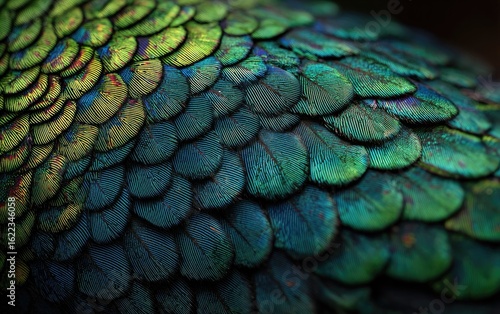 © Miqdad, Obraz premium Close-up view of vibrant, overlapping feathers in shades of green, teal, and blue. Detailed texture shows intricate, scaled patterns