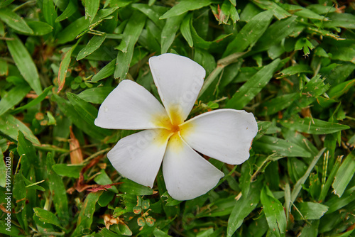 Fototapeta premium Close-up view of white Frangipani flower on grass