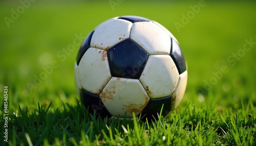 Obraz premium Close-up view of worn soccer ball, grass stains visible, training, equipment,...
