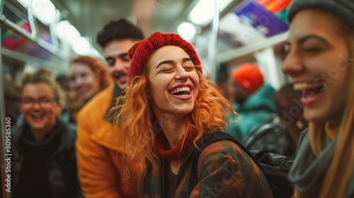 Obraz premium Close-up view of young woman and friends laughing together on a crowded on a bus
