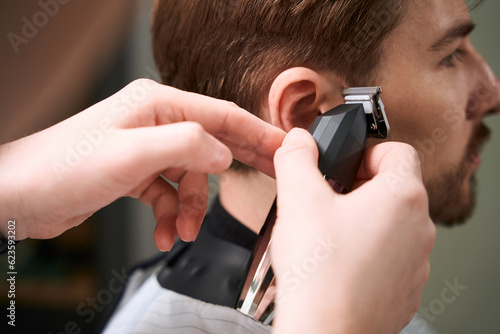 © Viacheslav Yakobchuk, Fototapeta premium Close up view on barber making haircut to his client
