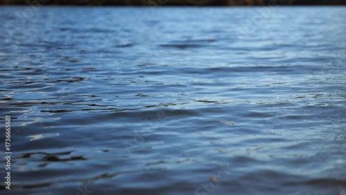 Fototapeta premium Close up view on lake with small waves at sunny day. Calm scenery of pond at summer season. Beautiful nature landscape. Concept of tranquility scene. Slow motion
