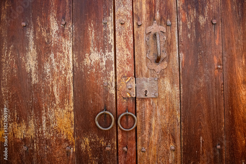 Fototapeta premium Close up view to a wooden weathered door with door rings in historic town...