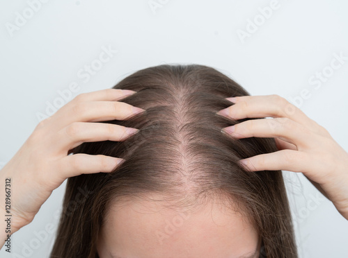 © ArinaDvl, Naklejka premium Close up view young woman massaging her scalp with hands stimulating new hair growth, copy space. Receding hairline. Alopecia treatment, scalp stimulation, hair loss and baldness targeted therapy.