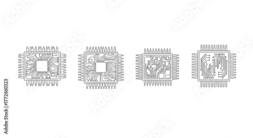© mahafuza, Obraz premium Close-up views of four distinct microchip circuits on a white backdrop showcasing intricate electronic components vector