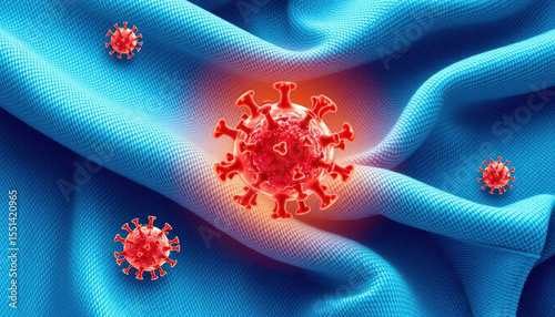 © Ornpitchayawee, Naklejka premium Close-up Visualization of Virus Cells on Blue Fabric Background, Highlighting Infection and Microscopic Details in a Unique Artistic Style