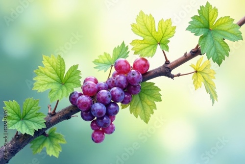 © nittiya, Obraz premium Close-up watercolor grapevine branch, lush leaves , artwork, background