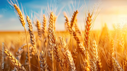 Fototapeta premium Close up wheat field at golden hour, bathed in warm sunlight, whole grain...