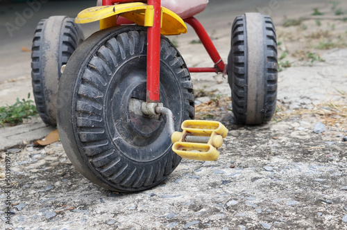 Naklejka premium close up wheel of old tricycle on dirty concrete ground