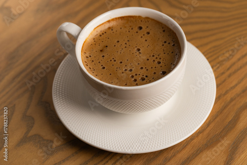 © Ruslan, Fototapeta premium Close Up White Cup of Hot Cappuccino on Wooden Table