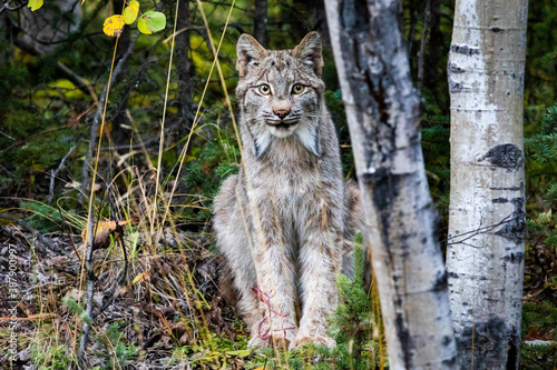 Naklejka premium Close up wild lynx portrait in the forest looking at the camera