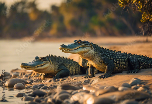 © sebi_2569, Naklejka premium Close-up with a group of many crocodiles on the shore