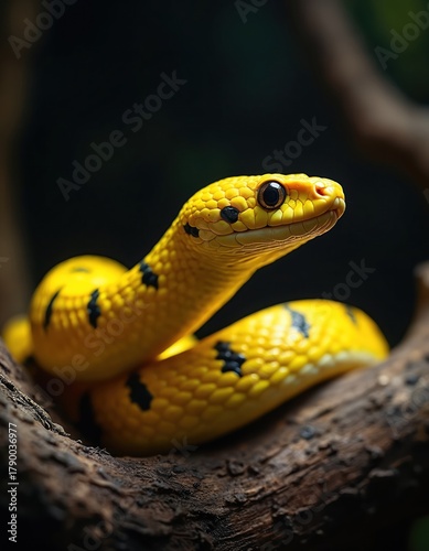 © Vadym, Fototapeta premium Close up with yellow snake with black spots on branch. Reptile looks at camera. The viper skin has a pattern. Zoo animal in its natural habitat. It can be poisonous.