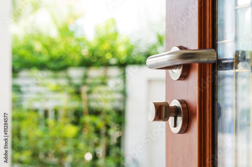 Obraz premium Close-up wooden door opening with blur garden background