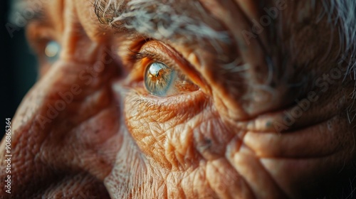 Obraz premium close up wrinkled eyes of old caucasian man 70-79 years old, thoughtful wise...