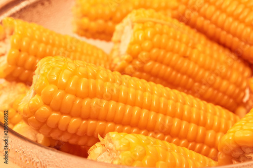 Fototapeta premium Close up yellow sweet corn grain, dense rows of boiled yellow corn seeds for background. Macro