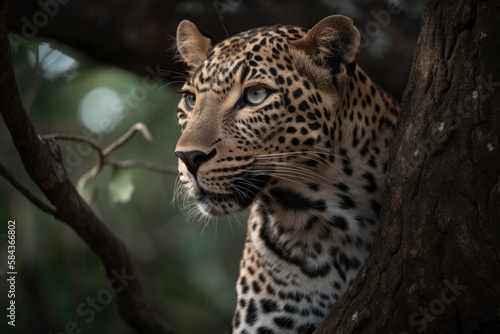 © Kowit, Fototapeta premium Close up young leopard portrait. Close up beautiful angry big leopard in forest. Generative Ai