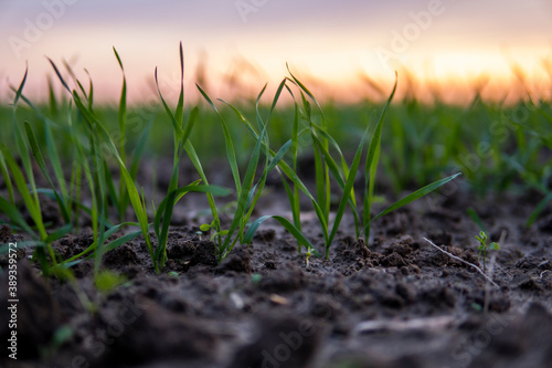 © Volodymyr_sh, Fototapeta premium Close up young wheat seedlings growing in a field. Green wheat growing in soil. Close up on sprouting rye agriculture on a field in sunset. Sprouts of rye. Wheat grows in chernozem planted in autumn.
