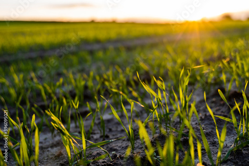 © Volodymyr_sh, Fototapeta premium Close up young wheat seedlings growing in a field. Green wheat growing in soil. Close up on sprouting rye agriculture on a field in sunset. Sprouts of rye. Wheat grows in chernozem planted in autumn.