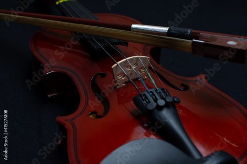 Fototapeta premium Close view of a classical small violin, strings and bridge over a dark black blanket background