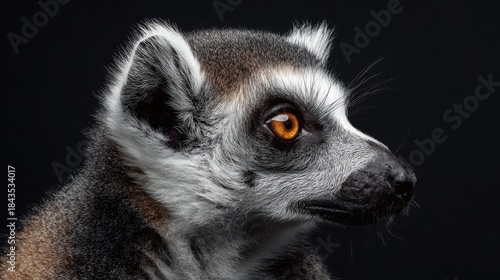 © Tanu, Fototapeta premium Close view of a lemur with bright eyes showing its features in a dark setting during a studio shoot