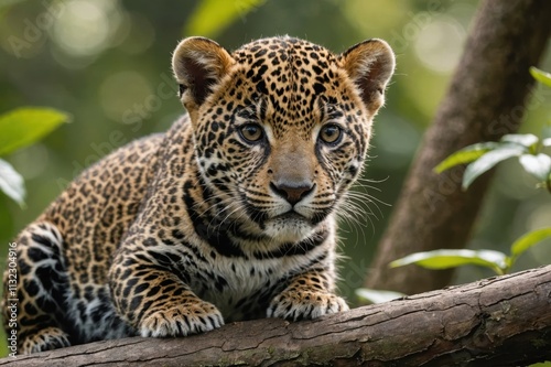 © ThomasLENNE, Obraz premium Close view of Jaguar cub against natural environment blurred background.