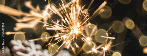 © Serenkonata, Obraz premium Close view of marshmallow in red cup with sparkler. soft selective focus. abstract bokeh background, copy space. Christmas or New Year composition.