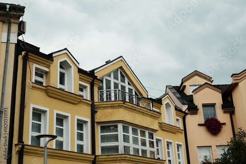 Naklejka premium Close view of yellow residential building with large windows and decorative...
