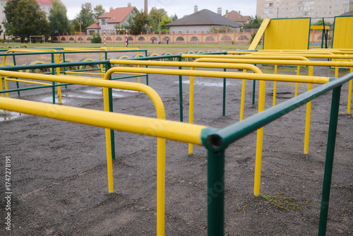 Fototapeta premium Close view shows yellow and green metal monkey bars on the playground in the...