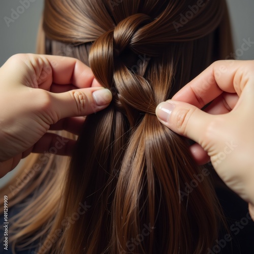 © IgorImageDoc, Obraz premium close woman hair being styled hairdresser woman has long straight hair styled half half down braid braid two strands hair tied together top bottom head hair light brown color appears healthy well
