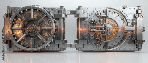 Fototapeta premium Closed and open bank vault doors on a white background, showcasing metal details and locking mechanisms. Concept of security. 3D Rendering. High quality
