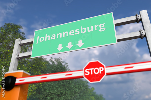 Naklejka premium Closed barrier with STOP sign at Johannesburg, South africa road sign. Coronavirus or some other disease quarantine related 3D rendering