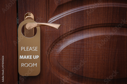 © Africa Studio, Fototapeta premium Closed door with sign PLEASE MAKE UP ROOM on handle at hotel