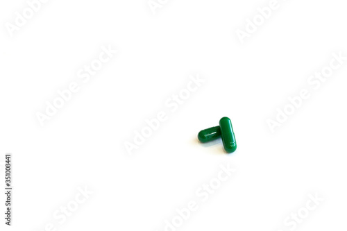 © Victoria, Naklejka premium Closed green capsule pills on a white background.Concept of medicine