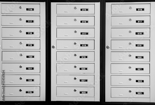 Fototapeta premium Closed metal mailboxes with keyholes and sequence numbers indoors