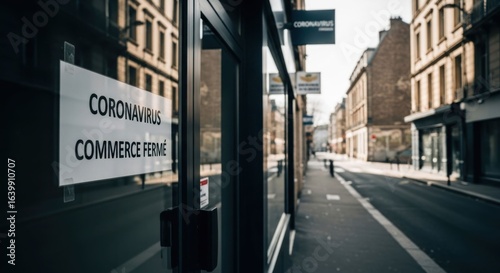 Fototapeta premium Closed shop on street; Coronavirus notice on window reflects buildings